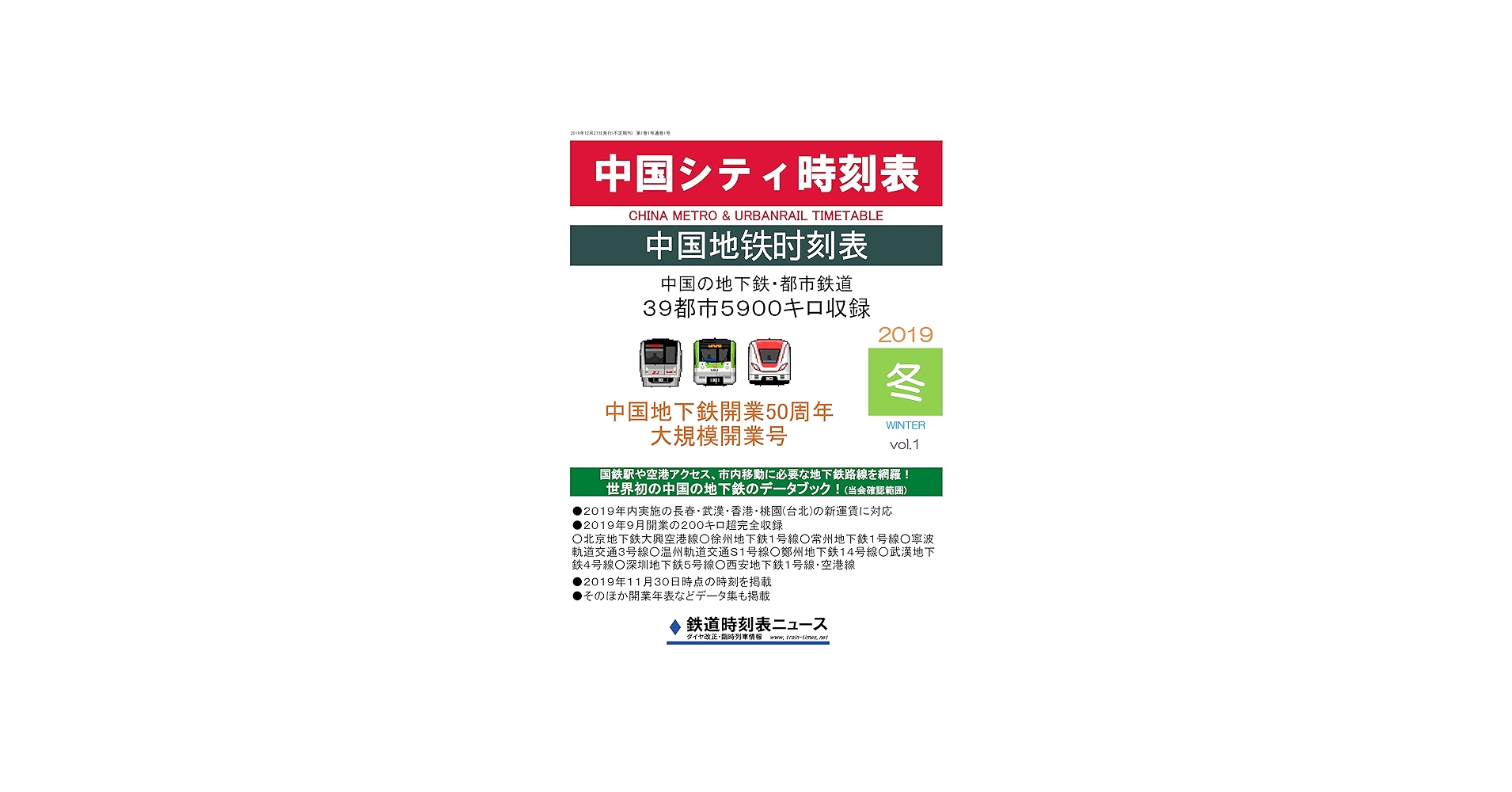 鉄道時刻表ニュース書籍部では、2019年12月28日より中国の地下鉄・都市鉄道の時刻表をまとめた中国シティ時刻表の頒布を開始いたしましたので、お知らせいたします。